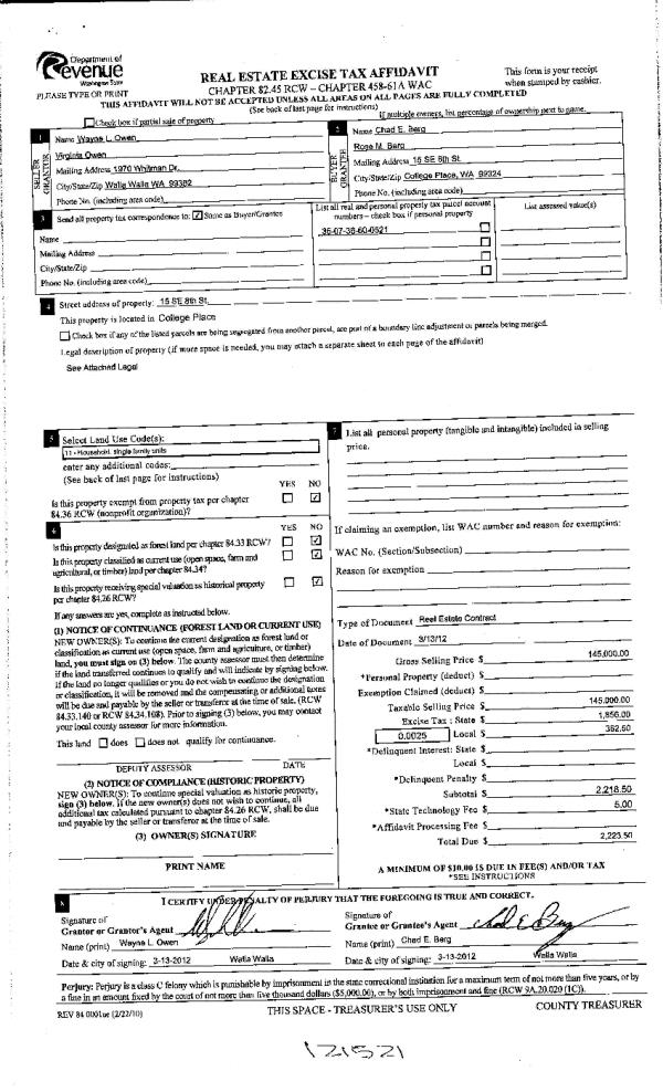 | 3 | 03/14/2012 | WARRANTY D | WARRANTY DEED | OWEN, WAYNE L & VIRGINIA | BERG, CHAD E & ROSE M | | | $145,000.00 | 121521 | 2012-02100 |