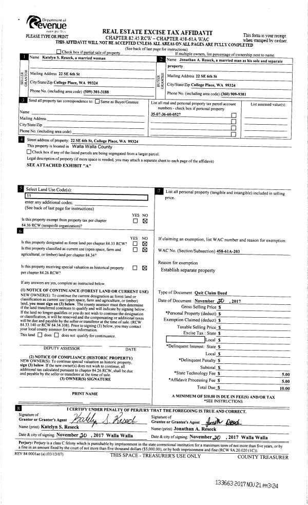 | 3 | 11/21/2017 | QCD | QUIT CLAIM DEED | RESECK KATELYN S | RESECK JONATHAN A | | | | 133663 | 2017-09407 |