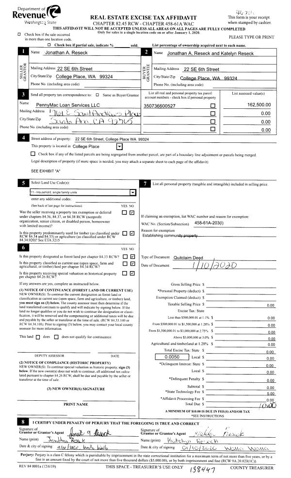 | 2 | 01/10/2020 | QCD | QUIT CLAIM DEED | RESECK JONATHAN A | RESECK JONATHAN A & KATELYN | | | $0.00 | 138447 | 2020-00466 |