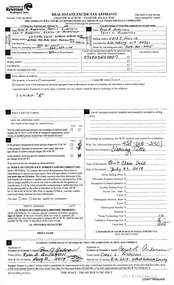 | 1 | 08/02/2019 | QCD | QUIT CLAIM DEED | | ANDERSEN ROSS A & CAROL L | | | | 137414 | 2019-05689 |