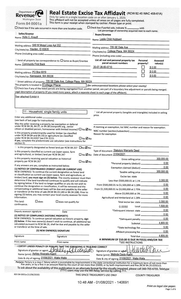 | 1 | 01/08/2021 | SWD | STATUTORY WARRANTY DEED | KNAUFT HOLLY C | CHILD-HUBBARD LESLIE | | | $300,000.00 | 140691 | 2021-00274 |