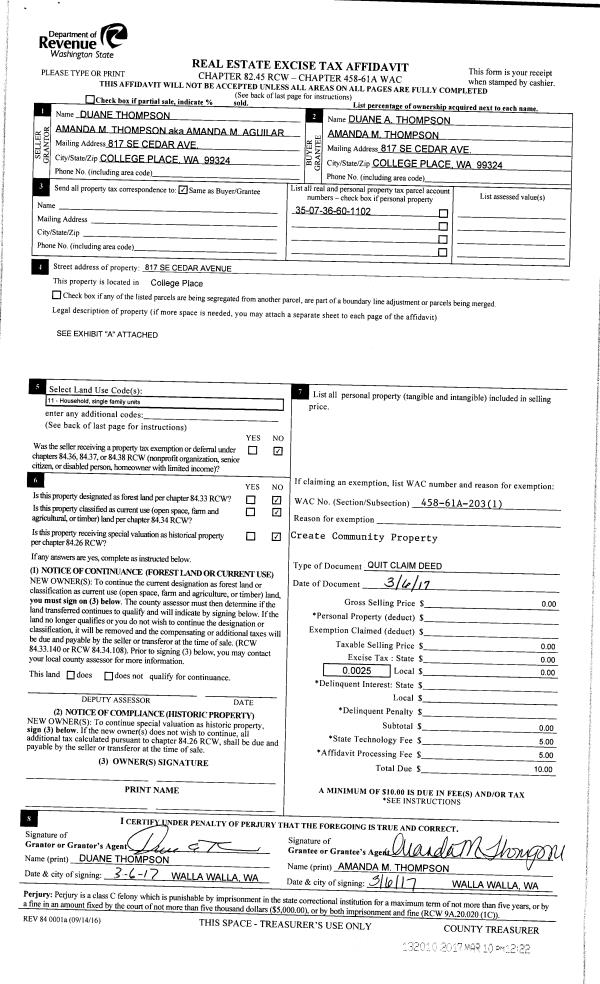 | 4 | 03/06/2017 | QCD | QUIT CLAIM DEED | THOMPSON DUANE | THOMPSON DUANE A & AMANDA M | | | $0.00 | 132010 | 2017-01873 |