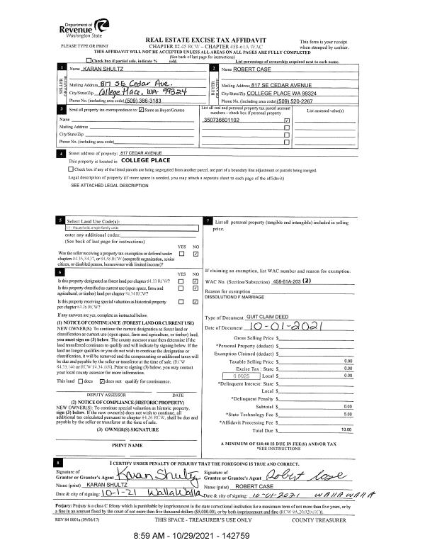 | 2 | 10/01/2021 | QCD | QUIT CLAIM DEED | CASE ROBERT A | CASE ROBERT | | | $0.00 | 142759 | 2021-13027 |
