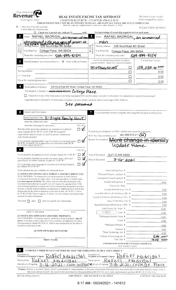 | 4 | 10/17/2005 | QCD | QUIT CLAIM DEED | MADRIGAL, RAFAEL & MARY LOU | MADRIGAL, RAFAEL | | | | 108777 | 2005-12999 |