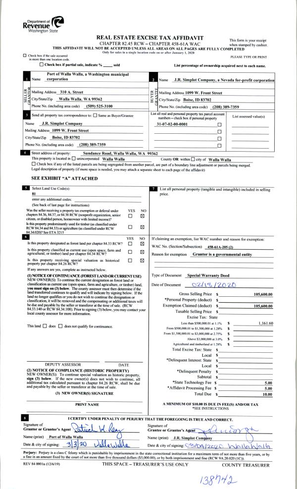| 1 | 03/05/2020 | WARRANTY D | WARRANTY DEED | WALLA WALLA PORT OF | JR SIMPLOT | | | $105,600.00 | 138742 | 2020-02081 |