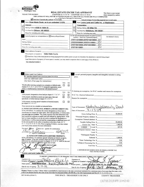 | 2 | 05/12/2020 | WARRANTY D | WARRANTY DEED | LYONS MICHAEL A | LYONS LAND AND CATTLE INC | | | $20,000.00 | 139089 | 2020-04087 |