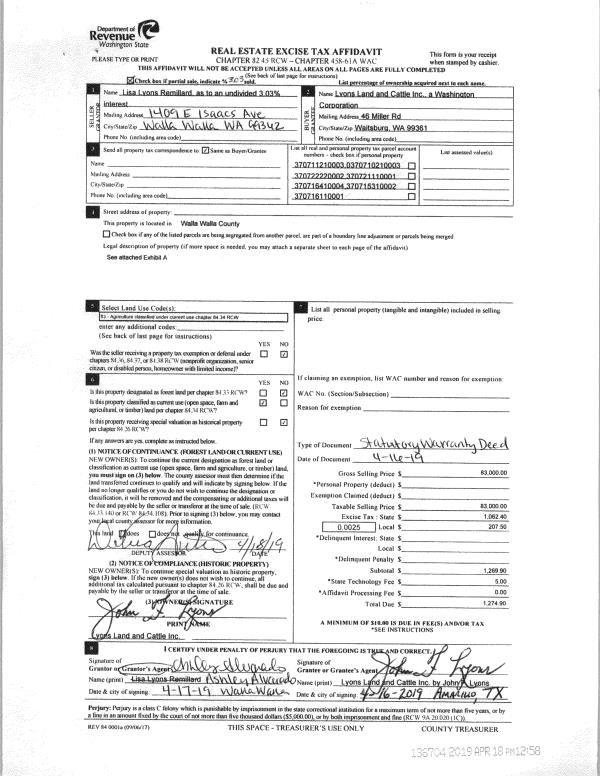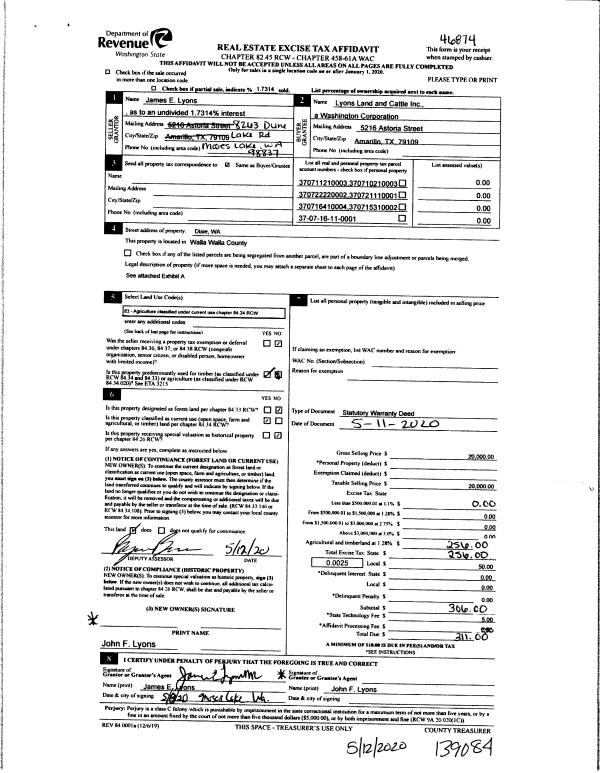 | 2 | 05/12/2020 | WARRANTY D | WARRANTY DEED | LYONS MICHAEL A | LYONS LAND AND CATTLE INC | | | $20,000.00 | 139089 | 2020-04087 |