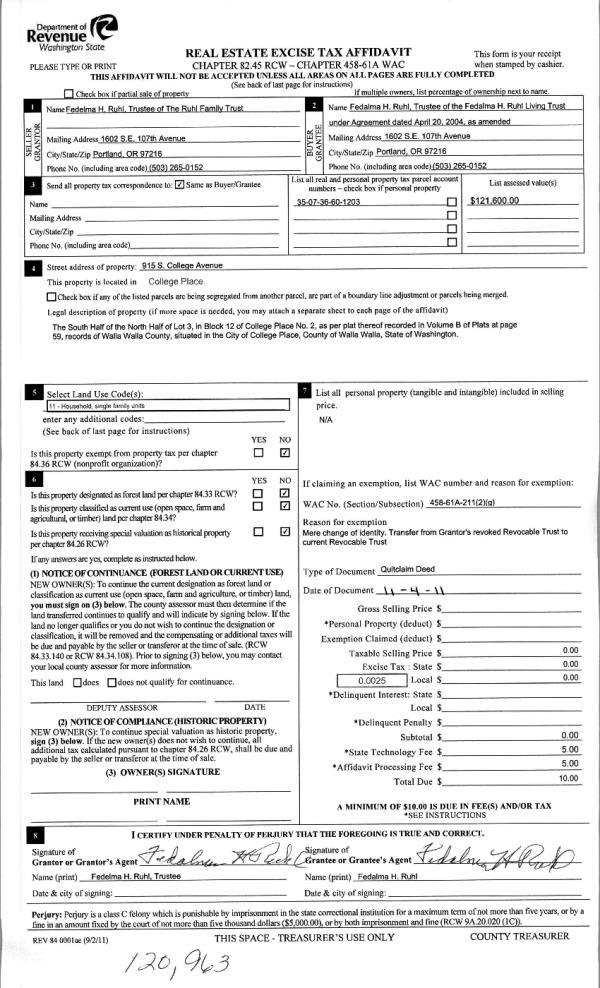 | 2 | 11/10/2011 | QCD | QUIT CLAIM DEED | RUHL FAMILY TRUST | RUHL, FEDALMA H | | | | 120963 | 2011-08863 |