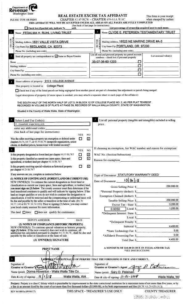 | 1 | 11/01/2018 | SWD | STATUTORY WARRANTY DEED | RUHL FEDALMA H | PETERSEN CLYDE E TESTAMENTARY TRUST | | | $250,000.00 | 135851 | 2018-09071 |