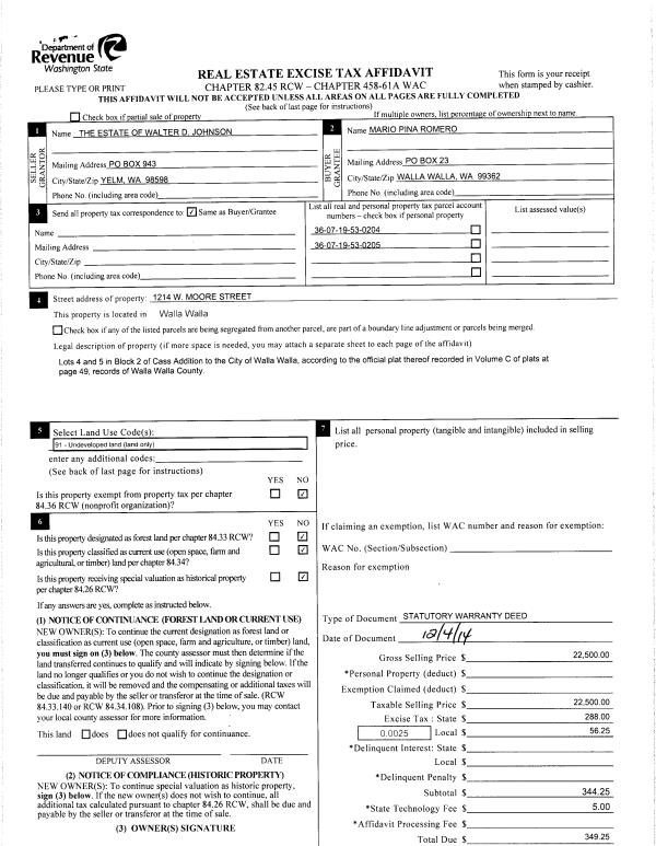 | 4 | 12/05/2014 | SWD | STATUTORY WARRANTY DEED | JOHNSON WALTER D ESTATE OF | ROMERO MARIO PINA | | 2-PARCELS | $22,500.00 | 127065 | 2014-08830 |