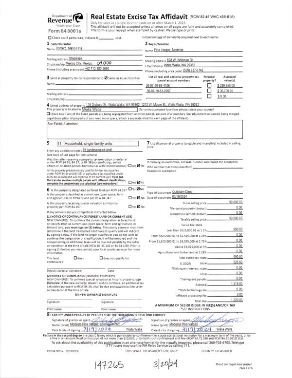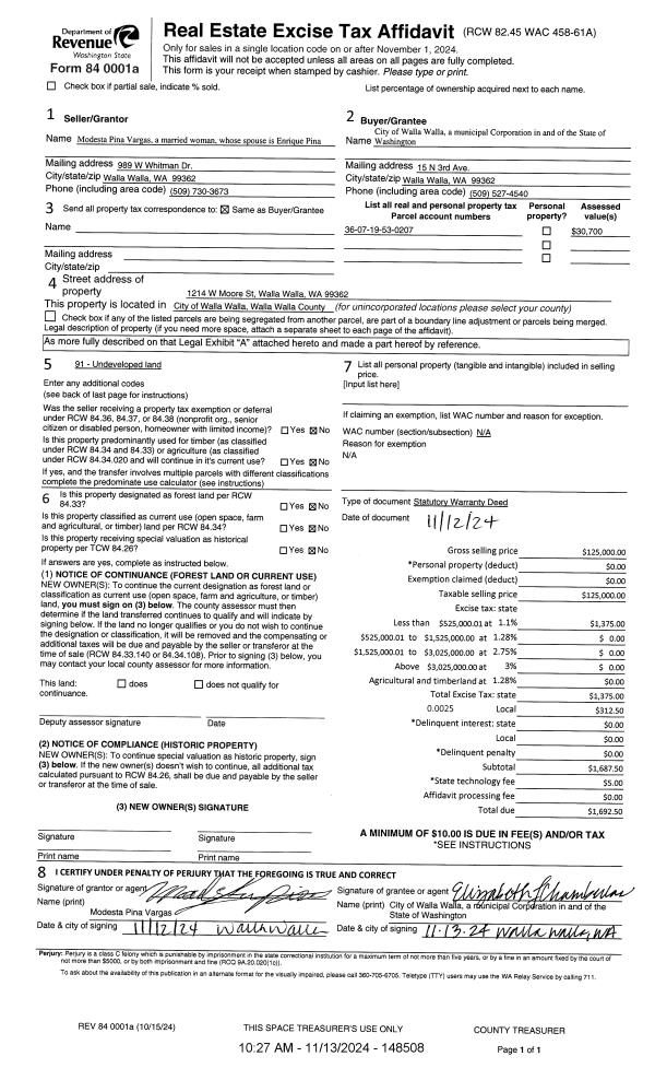 | 1 | 11/13/2024 | SWD | STATUTORY WARRANTY DEED | VARGAS MODESTA PINA | WALLA WALLA CITY OF | | | $125,000.00 | 148508 | 2024-06580 |