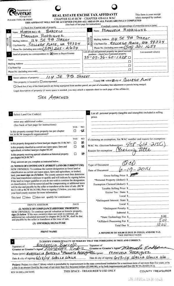 | 3 | 06/20/2014 | QCD | QUIT CLAIM DEED | BARCELO HORTENCIA | RODRIQUEZ MANUELA | | | | 126102 | 2014-04247 |