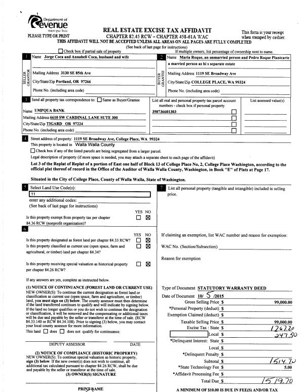 | 3 | 10/07/2015 | SWD | STATUTORY WARRANTY DEED | COCA JORGE & ANNABELL | ROQUE MARIA | | | $99,000.00 | 128965 | 2015-08851 |