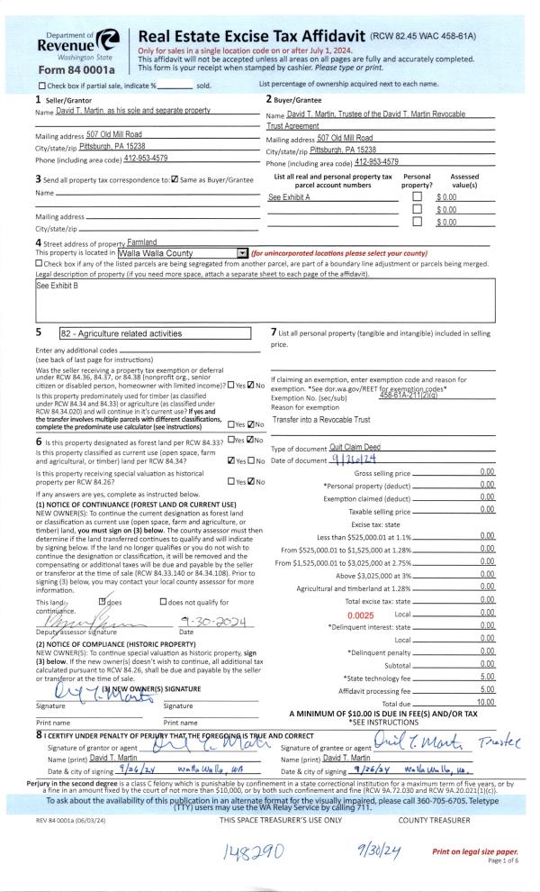 | 1 | 09/30/2024 | QCD | QUIT CLAIM DEED | MARTIN DAVID T | MARTIN DAVID T REV TRUST AGREEMENT | | | | 148290 | 2024-05638 |