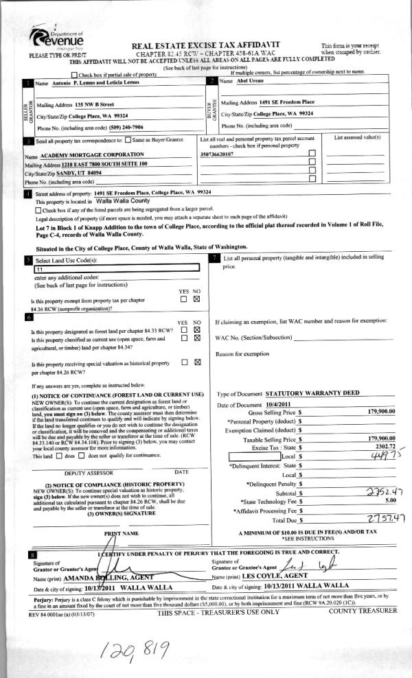 | 4 | 10/13/2011 | WARRANTY D | WARRANTY DEED | LEMUS, ANTONIO P & LETICIA | URENO, ABEL | | | $179,900.00 | 120819 | 2011-08017 |