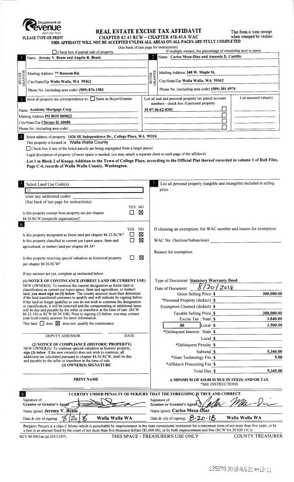 | 1 | 08/21/2018 | SWD | STATUTORY WARRANTY DEED | BEAM JEREMY V & ANGELA R | MEZA-DIAZ CARLOS | | | $300,000.00 | 135378 | 2018-06895 |