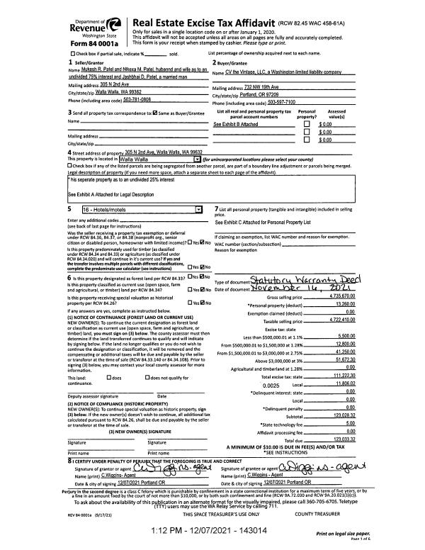 | 1 | 12/07/2021 | WARRANTY D | WARRANTY DEED | | CV THE VINTAGE LLC | | 7-PARCELS | $4,722,410.00 | 143014 | 2021-14409 |