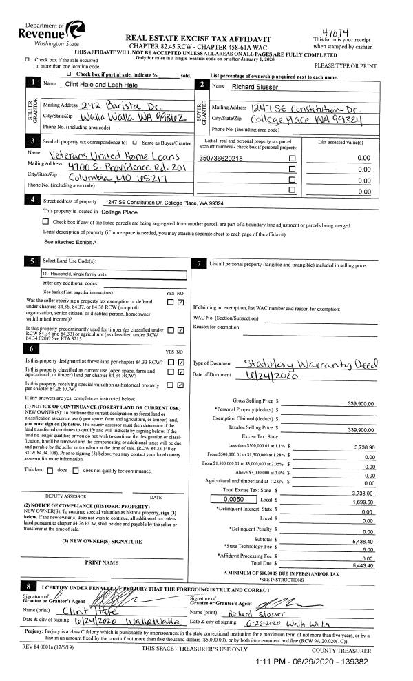| 1 | 06/29/2020 | SWD | STATUTORY WARRANTY DEED | HALE CLINT & LEAH | SLUSSER RICHARD | | | $339,900.00 | 139382 | 2020-06000 |