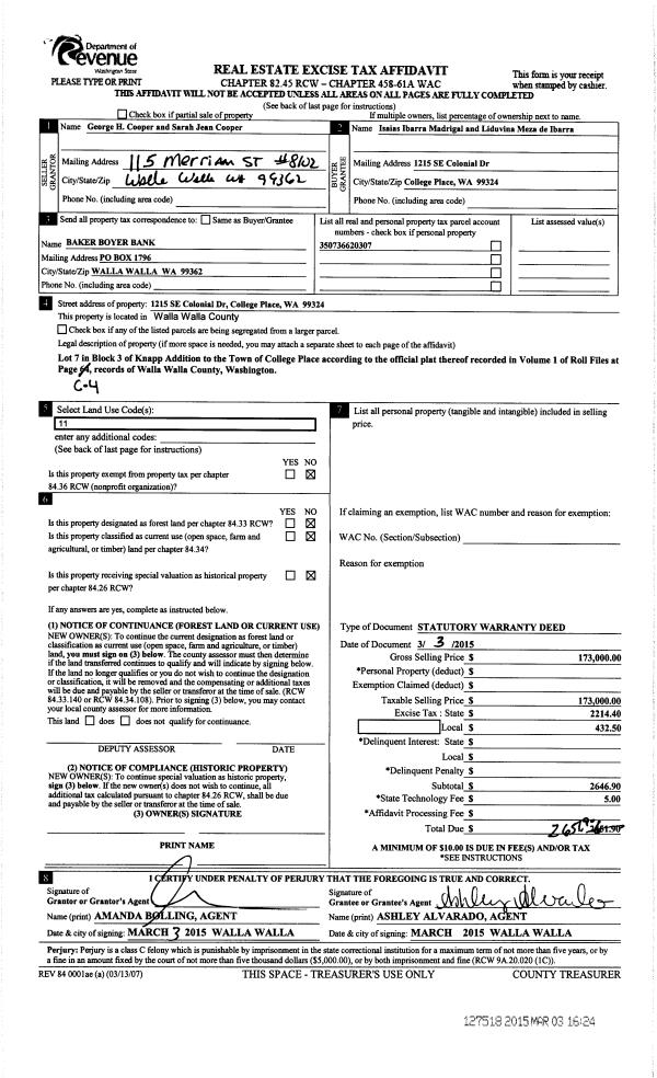 | 1 | 03/03/2015 | SWD | STATUTORY WARRANTY DEED | COOPER GEORGE H & SARAH JEAN | MADRIGAL ISAIAS IBARRA | | | $173,000.00 | 127518 | 2015-01838 |