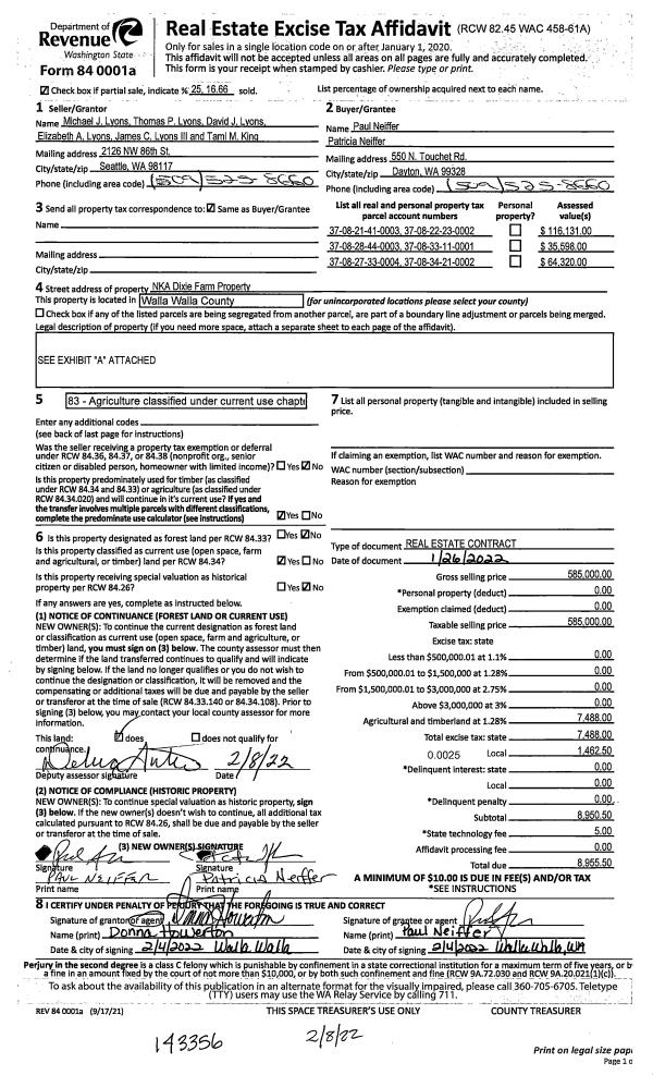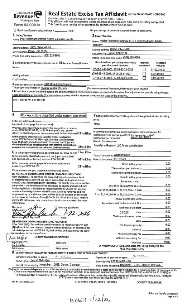 | 1 | 01/22/2026 | WARRANTY D | WARRANTY DEED | NEIFFER PAUL & PATRICIA | NEIFFER FARMLAND HOLDINGS LLC | | | | 150671 | 2026-00397 |