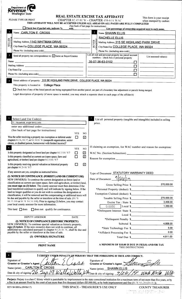 | 2 | 09/27/2019 | SWD | STATUTORY WARRANTY DEED | CROSS CARLTON E | ELLIS SHAWN & RACHELLE | | | $270,000.00 | 137765 | 2019-07668 |