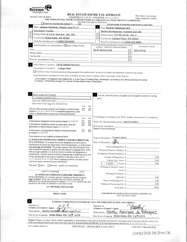 | 1 | 01/29/2018 | TRUSTEES D | TRUSTEE'S DEED | SERJEANT PHILIP T | VELAZQUEZ RICARDO & BERTHA DE | | | $209,445.00 | 134062 | 2018-00802 |
