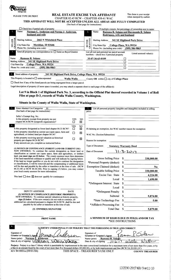 | 1 | 11/09/2017 | SWD | STATUTORY WARRANTY DEED | ANDERSON NORMAN L & NORMA J | RODRIQUEZ RAYMUNDO R SOLANO | | | $330,000.00 | 133590 | 2017-09023 |