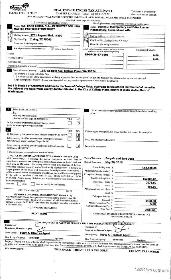 | 2 | 07/02/2015 | BARGAIN & | BARGAIN & SALE DEED | US BANK TRUST | MONTGOMERY DARREN J & ERIKA JOANNE | | | $162,000.00 | 128310 | 2015-05681 |
