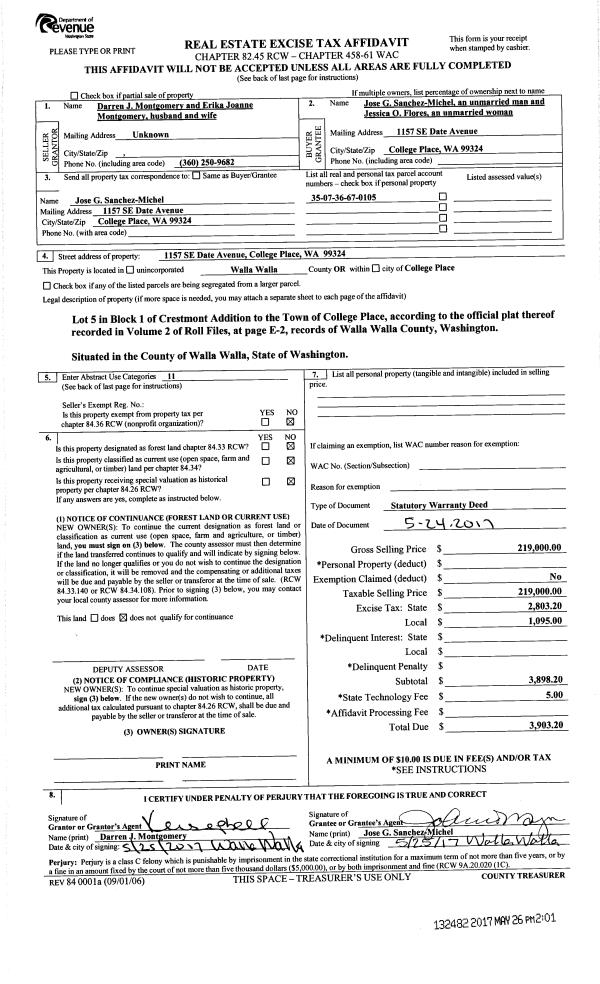 | 1 | 05/26/2017 | SWD | STATUTORY WARRANTY DEED | MONTGOMERY DARREN J & ERIKA JOANNE | SANCHEZ-MICHEL JOSE G | | | $219,000.00 | 132482 | 2017-04022 |