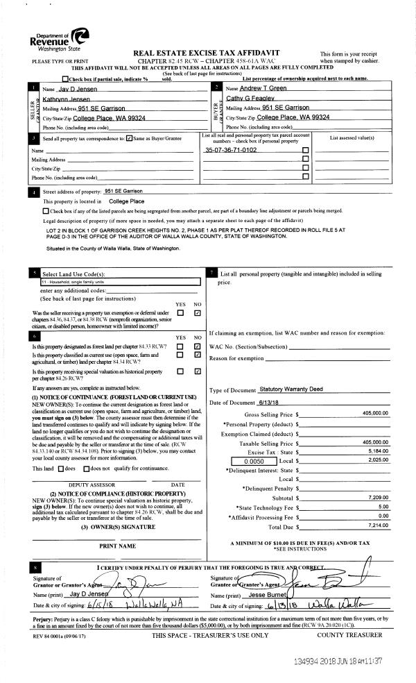 | 1 | 06/18/2018 | SWD | STATUTORY WARRANTY DEED | JENSEN JAY D & KATHRYNN | GREEN ANDREW T | | | $405,000.00 | 134934 | 2018-04875 |