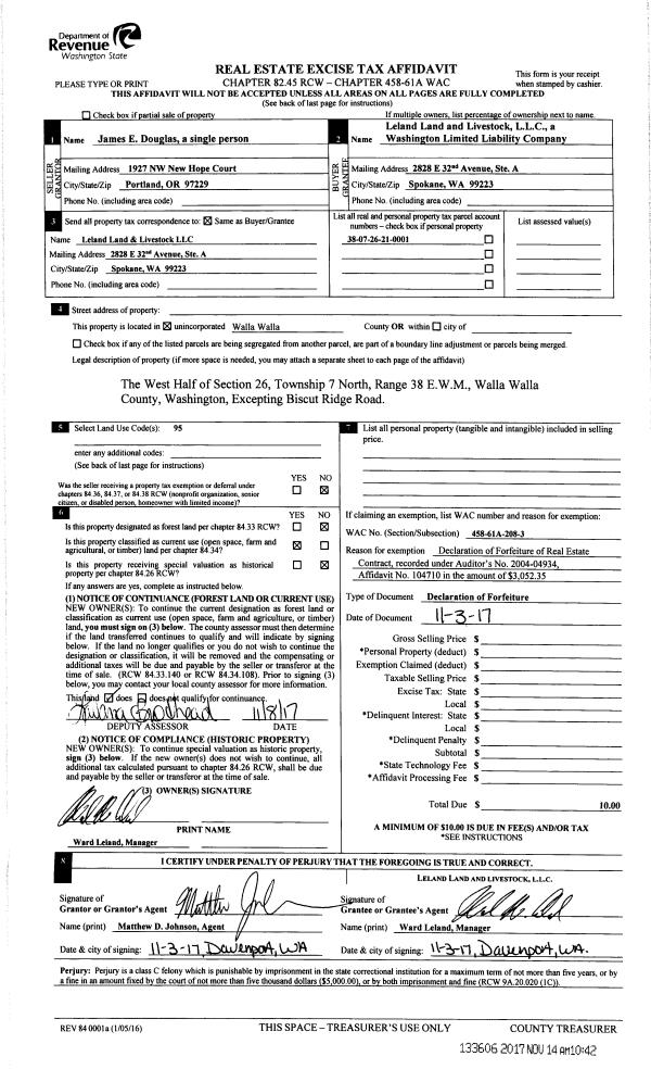| 4 | 11/03/2017 | DECF | DECLARATION OF FOREFEITURE | DOUGLAS JAMES E | LELAND LAND AND LIVESTOCK LLC | | | $0.00 | 133606 | 2017-09543 |