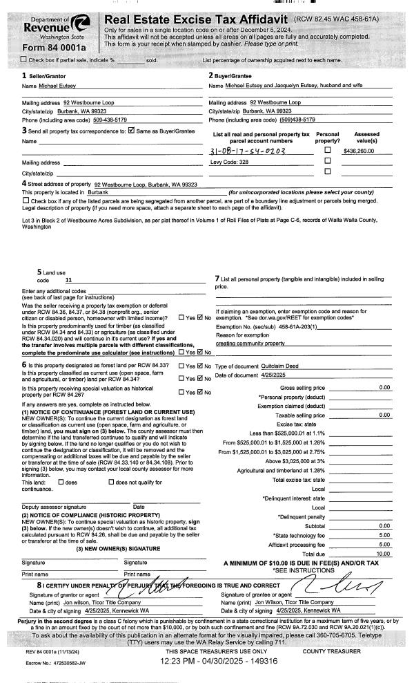 | 1 | 07/25/2025 | QCD | QUIT CLAIM DEED | EUTSEY MICHAEL | EUTSEY MICHAEL & JACQUELYN | | | | 149316 | 2025-02332 |