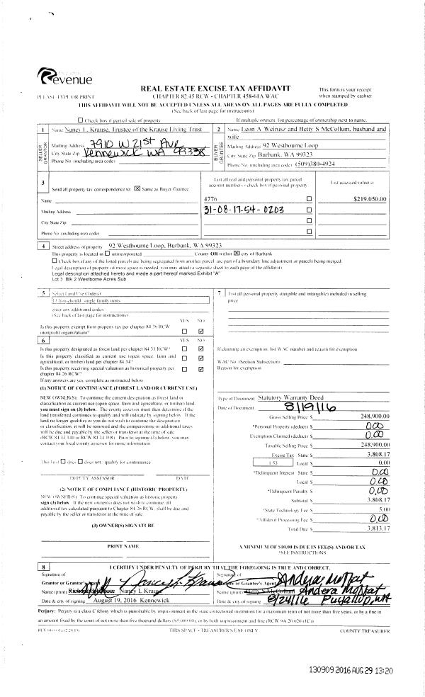 | 4 | 09/01/2016 | SWD | STATUTORY WARRANTY DEED | KRAUSE RICHARD D & NANCY L TRUSTEES | WEIRUSZ LEON A | | | $248,900.00 | 130909 | 2016-07092 |