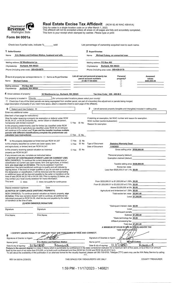 | 2 | 11/17/2023 | SWD | STATUTORY WARRANTY DEED | MATTOX ERIC & KATHLEEN | EUTSEY MICHAEL | | | $538,000.00 | 146821 | 2023-06774 |