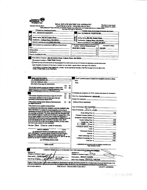 | 1 | 05/23/2016 | QCD | QUIT CLAIM DEED | SANCHEZ RODOLFO & GLENDA | FUENTEALBA GLENDA M | | | $0.00 | 130273 | 2016-03901 |
