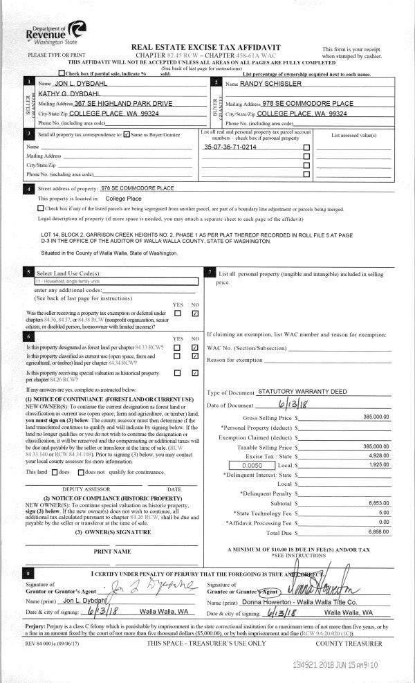 | 1 | 06/15/2018 | SWD | STATUTORY WARRANTY DEED | DYBDAHL JON L & KATHY | SCHISSLER RANDY | | | $385,000.00 | 134921 | 2018-04769 |