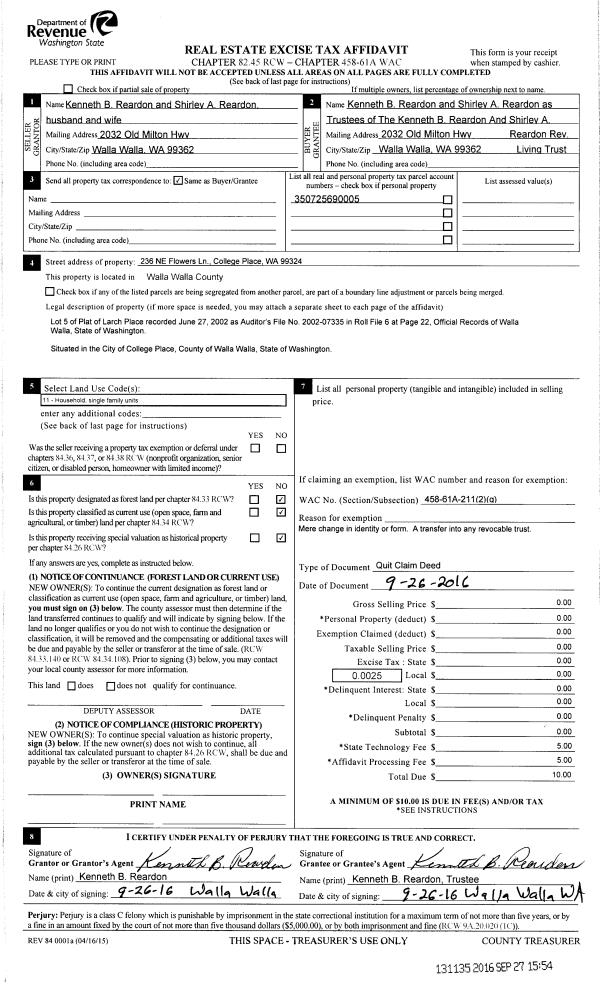 | 1 | 09/26/2016 | QCD | QUIT CLAIM DEED | REARDON KENNETH & SHIRLEY | REARDON KENNETH B & SHIRLEY A REVOCABLE LIVING TRUST | | | $0.00 | 131135 | 2016-07946 |