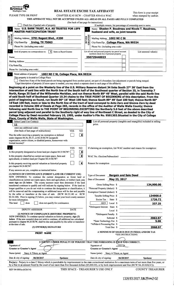| 3 | 06/29/2017 | BARGAIN & | BARGAIN & SALE DEED | US BANK TRUST NA | BOUDREAU SHADEN P | | | $134,900.00 | 132693 | 2017-05002 |