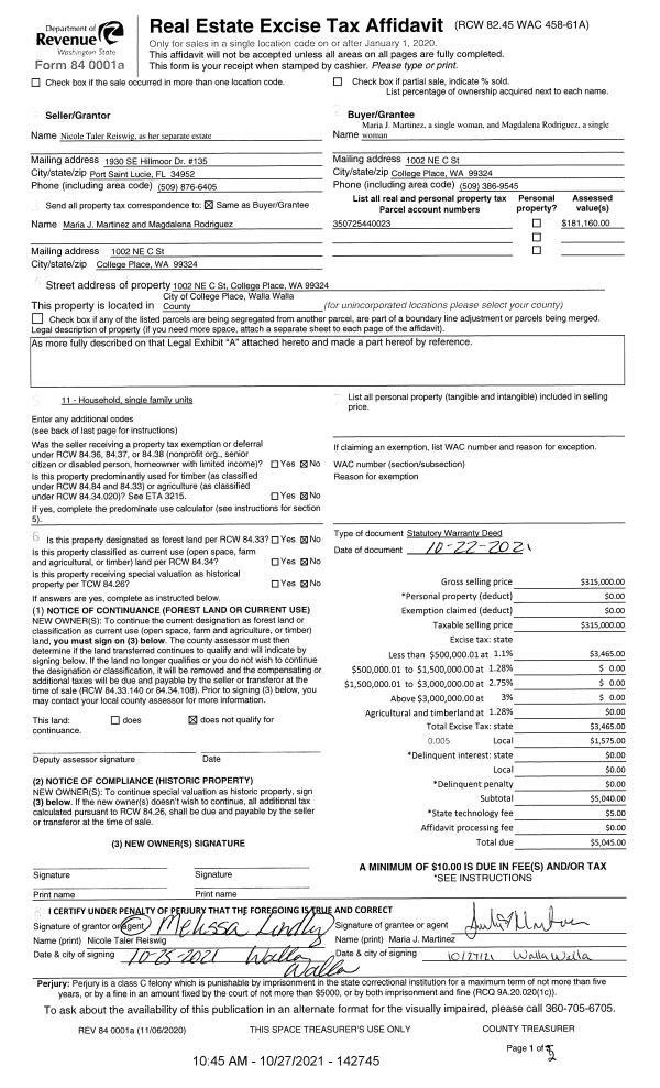 | 1 | 10/27/2021 | SWD | STATUTORY WARRANTY DEED | REISWIG NICOLE TALER | MARTINEZ MARIA J | | | $315,000.00 | 142745 | 2021-12945 |