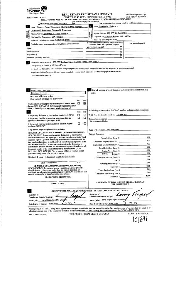 | 6 | 02/14/2017 | QCD | QUIT CLAIM DEED | PETERSON SHARON RENE ET AL | PETERSON SHIRLEY M | | | | 0 | 2017-01225 |