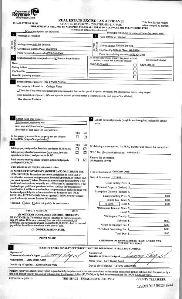 | 8 | 12/20/2012 | QCD | QUIT CLAIM DEED | PETERSON, DON C | PETERSON, SHIRLEY M | | | | 0 | 2012-11393 |
