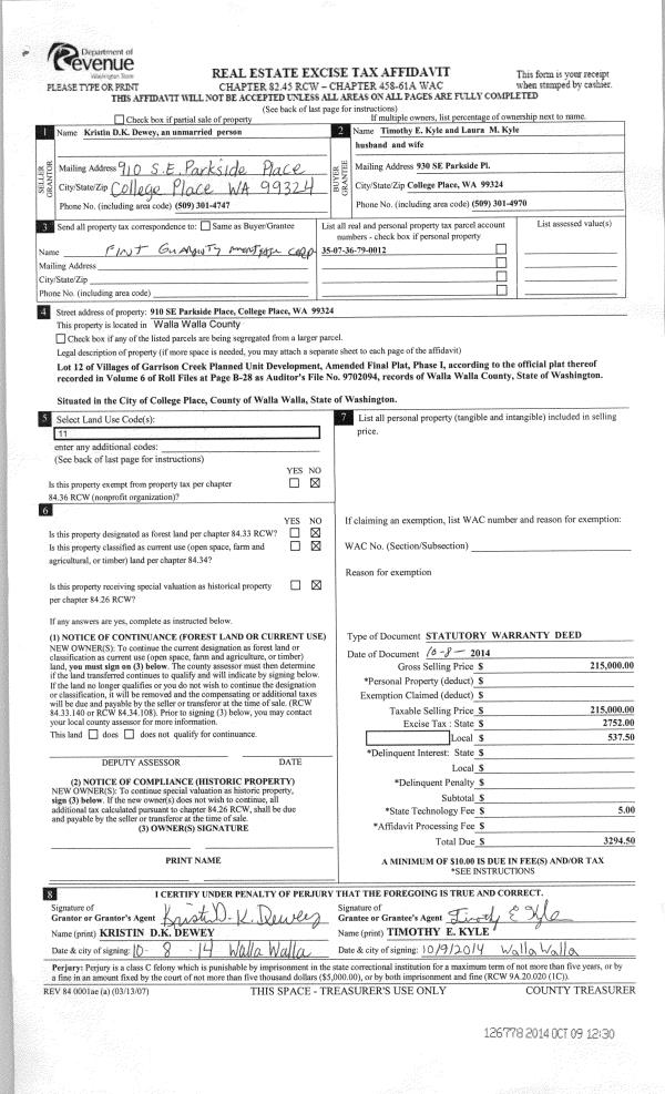 | 2 | 10/09/2014 | SWD | STATUTORY WARRANTY DEED | DEWEY KRISTIN D K | KYLE TIMOTHY E & LAURA M | | | $215,000.00 | 126778 | 2014-07430 |