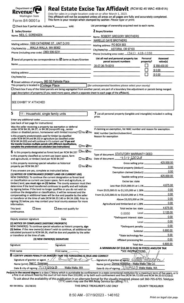 | 1 | 07/19/2023 | SWD | STATUTORY WARRANTY DEED | SORENSEN NEIL C | BROTHERS ROBERT GREGORY & NARELLE GAYE | | | $425,000.00 | 146162 | 2023-04051 |