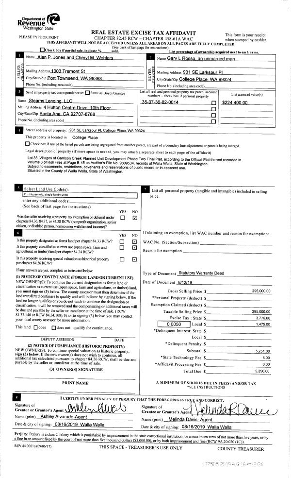 | 1 | 08/16/2019 | SWD | STATUTORY WARRANTY DEED | JONES ALAN P | ROSSO GARY L | | | $295,000.00 | 137505 | 2019-06207 |