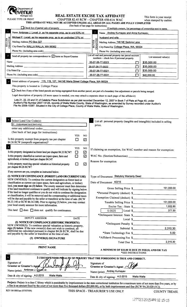 | 3 | 04/02/2015 | SWD | STATUTORY WARRANTY DEED | | KURNAYEV ANDREY & ANNA | | 4-PARCELS | $151,000.00 | 127723 | 2015-02727 |