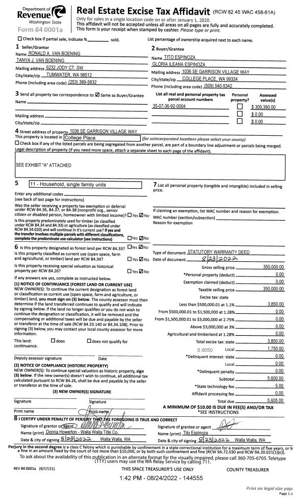 | 2 | 08/24/2022 | SWD | STATUTORY WARRANTY DEED | VAN BOENING RONALD A | ESPINOZA TITO & GLORIA ILEANA | | | $350,000.00 | 144555 | 2022-07088 |