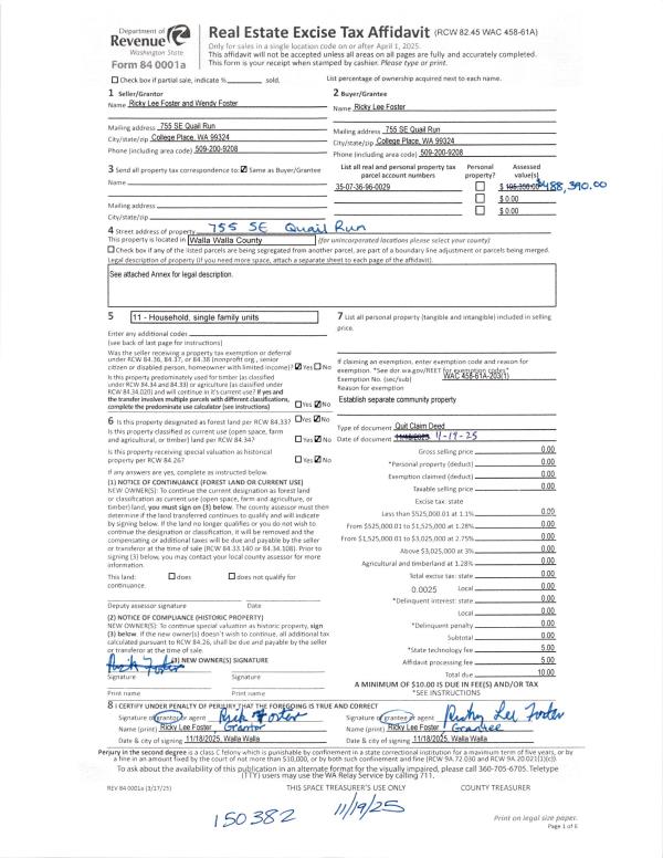 | 1 | 11/19/2025 | QCD | QUIT CLAIM DEED | FOSTER RICK L & WENDY | FOSTER RICK LEE | | | | 0 | 2025-07168 |