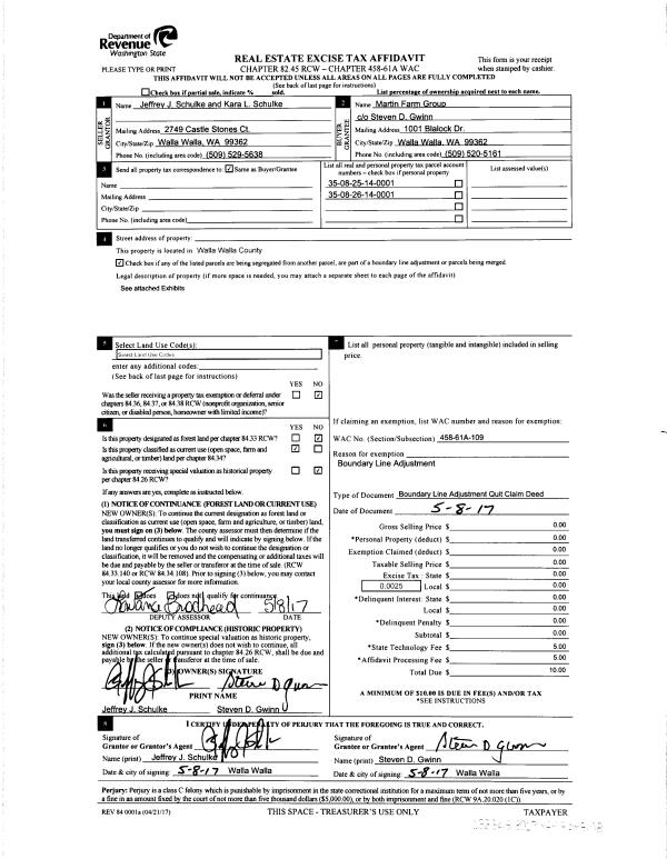 | 1 | 05/15/2017 | QCD | QUIT CLAIM DEED | SCHULKE JEFFREY J & KARA L | GWINN MARTIN | | | | 132346 | 2017-03481 |