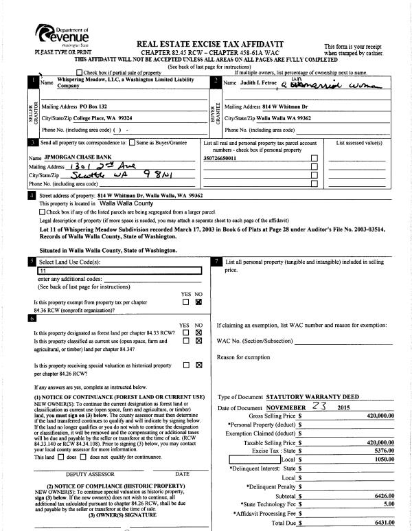 | 2 | 11/23/2015 | SWD | STATUTORY WARRANTY DEED | WHISPERING MEADOWS LLC | FETROE JUDITH I | | | $420,000.00 | 129244 | 2015-10141 |