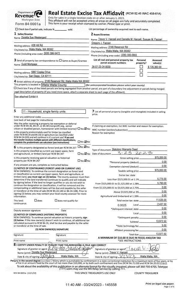 | 1 | 03/24/2023 | SWD | STATUTORY WARRANTY DEED | WESTERGARD DORETTA SUE | HANZELI TREVOR V & DANIELLE M | | | $975,000.00 | 145558 | 2023-01509 |